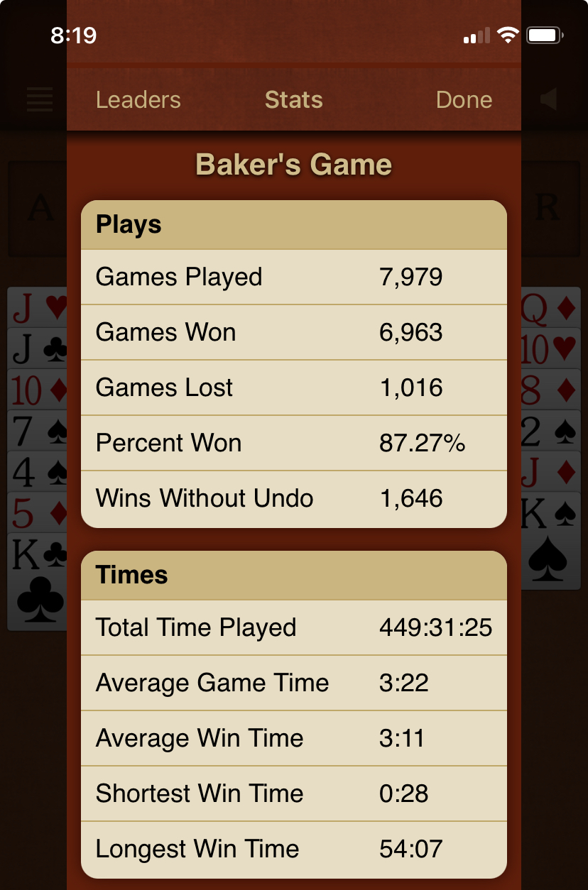• Solebon Solitaire, a free iPhone app. I’ve been playing “Baker’s Game” on it for years — and that’s not a joke. My stats are below. Those 449 hours? That’s 18 days of my life playing this game. (I installed it more than a decade ago, so that’s not awful… right?)