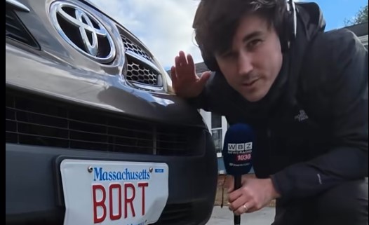 The guy standing next to the license plate isn’t Katie Unis, though. It’s Matt Shearer, a reporter for WBZ NewsRadio in Boston. Shearer (who may be related to Harry, I have no idea!) wanted to talk to Unis because Itchy & Scratchy Land isn’t the only place one can buy a fake “BORT” license plate. You can also get one on Amazon, as seen here. And that caused a problem for Unis.